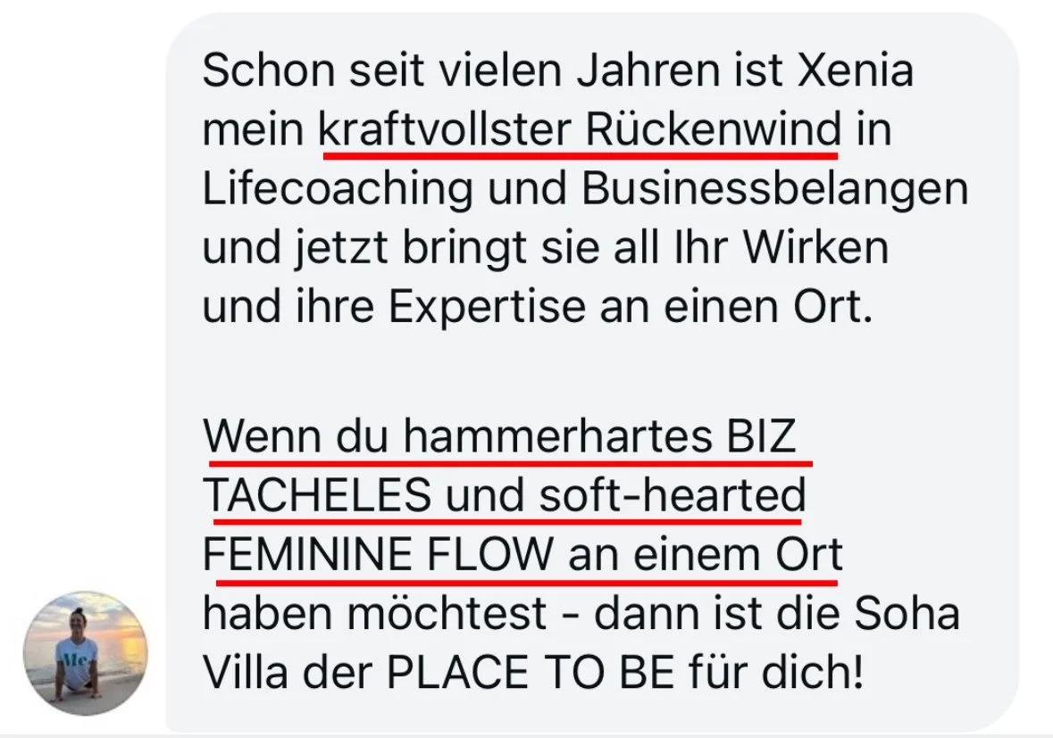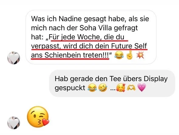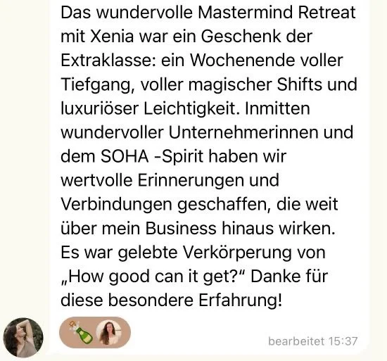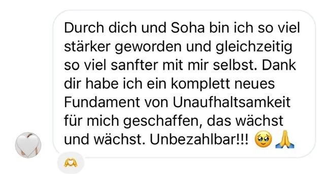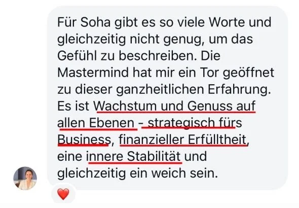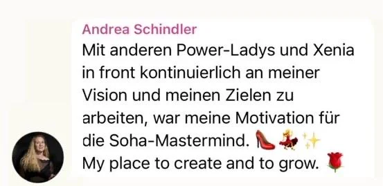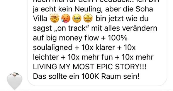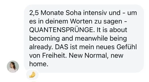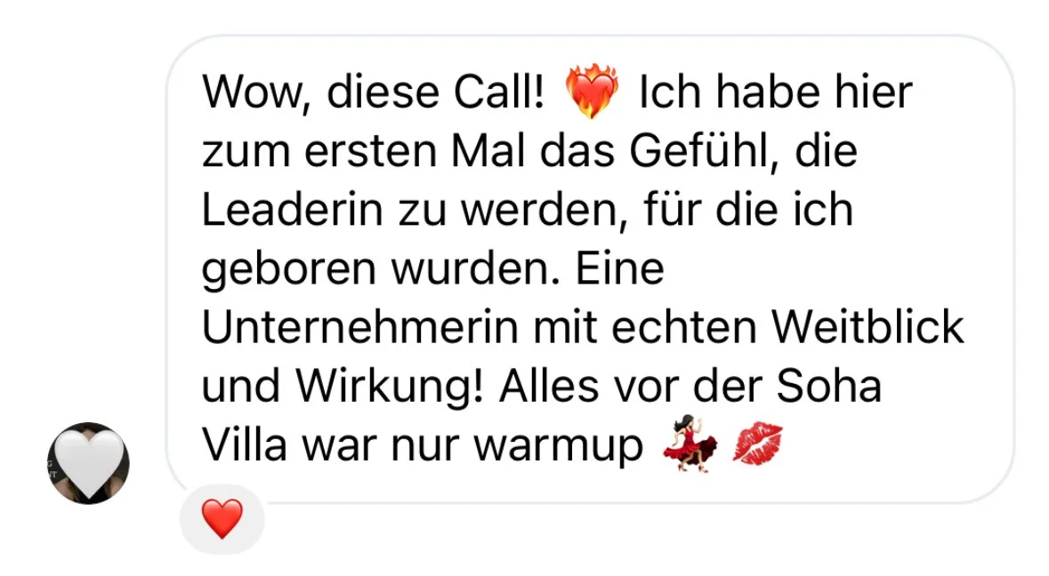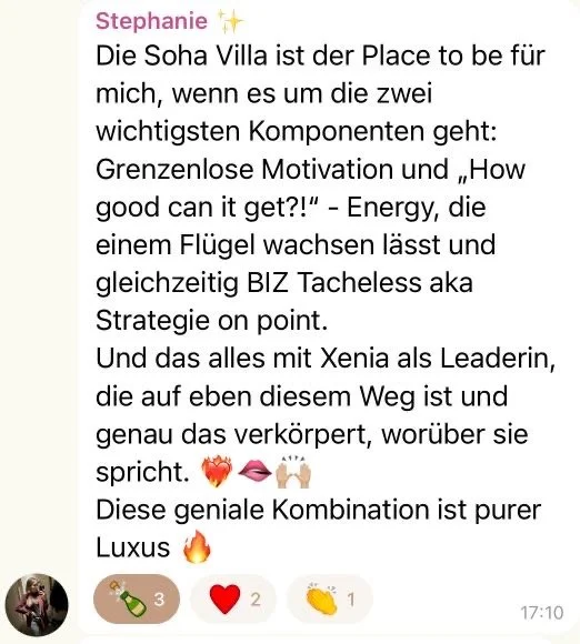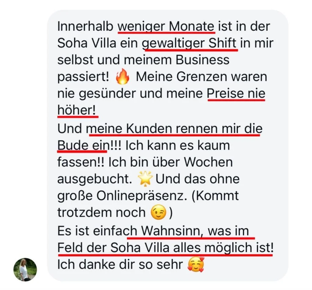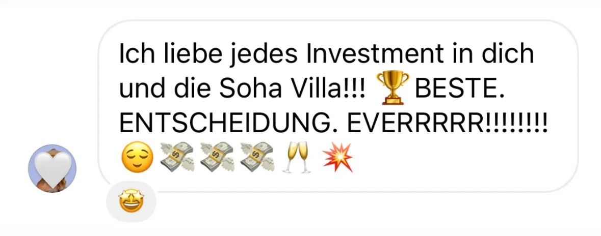 “Ich bin von 0 in der Soha Villa gestartet und feiere schon nach 8 Wochen meinen ersten großen Kunden - mit dem Potenzial, dass daraus 100 neue Möglichkeiten entstehen!! Zudem ist mein Flagship-Angebot im multi-vierstelligen Bereich bereits am Start & die ersten Buchungen sind gelandet!! …Aber das Wichtigste: Ich leben mein Business genau so wie ich es will & mit dem besten Rückenwind, den ich mir vorstellen kann!”